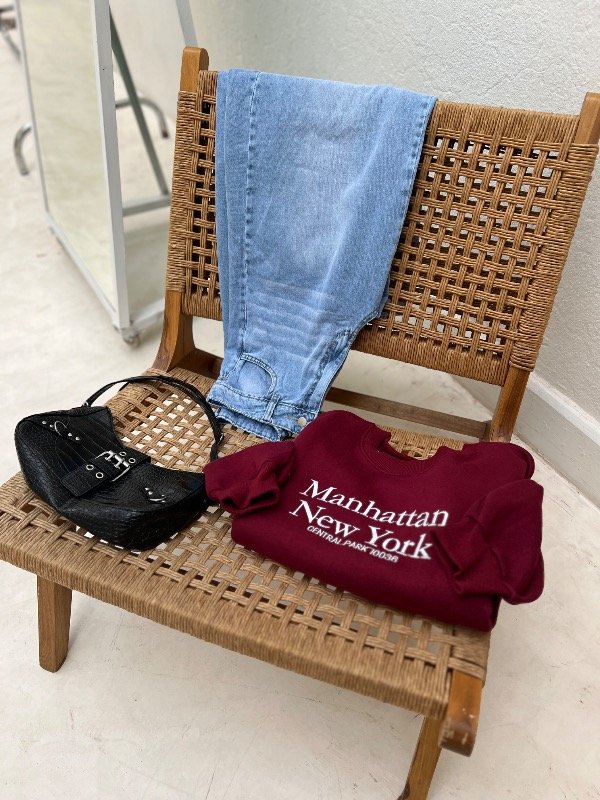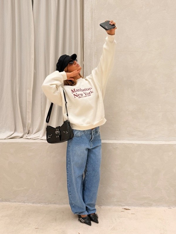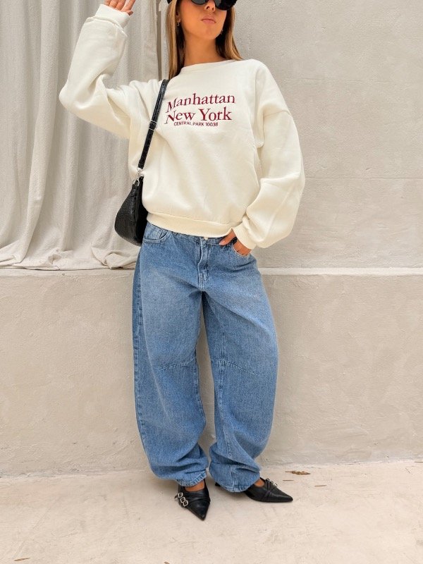 Buzo de algodón con cuello redondo y estampa frontal “Manhattan New York”. Calce cómodo y relajado, ideal para looks urbanos y de todos los días.