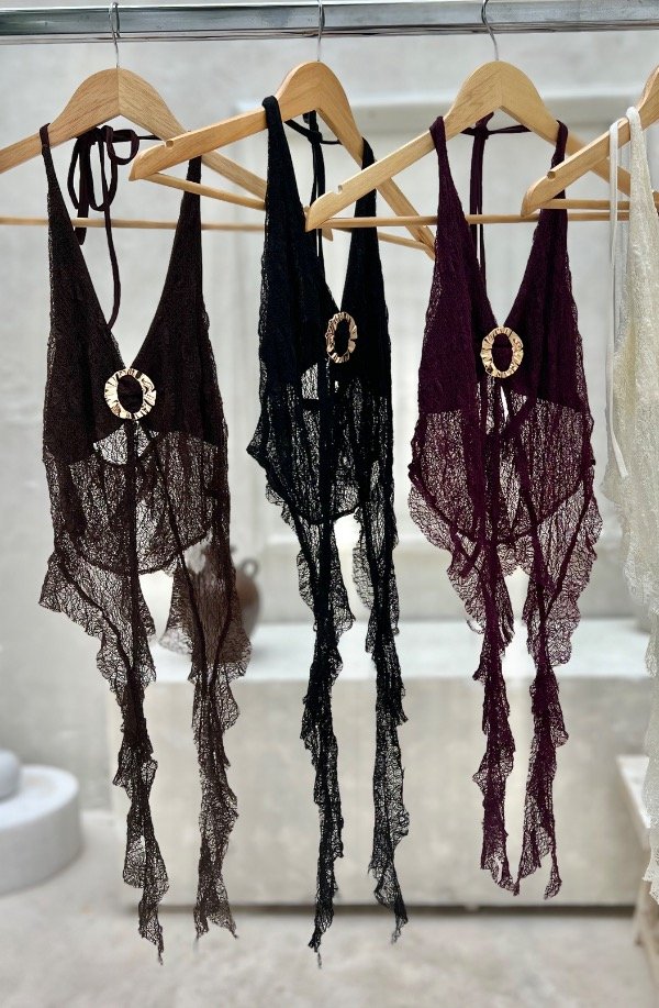 Top encaje y puntilla, con hebilla, volados tipo medusa! Va hasta un talle 95 de busto. Es talle único.